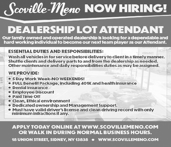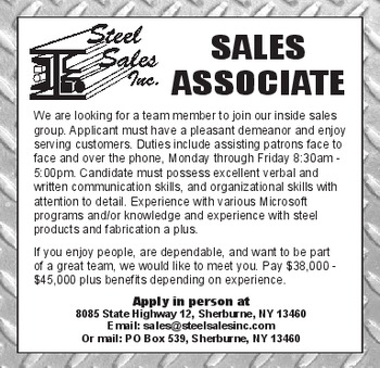 SALES ASSOCIATE STEEL SALES INC. is looking for a team member to join our inside sales group. Applicant must have a pleasant demeanor and enjoy serving customers. Duties include assisting patrons face to face and over the phone, Monday through Friday 8:30am -5:00pm. Candidate must possess excellent verbal and written communication skills, and organizational skills with attention to detail. Experience with various Microsoft programs and/or knowledge and experience with steel products and fabrication a plus. If you enjoy people, are dependable, and want to be part of a great team, we would like to meet you. Pay $38,000-$45,000 plus benefits depending on experience. Apply in person at 8085 State Highway 12, Sherburne, NY 13460. Email: sales@steelsalesinc.com. Or mail: P.O. Box 539, Sherburne, NY 13460.