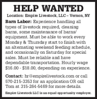 Wanted person to work on Dairy Farm; tractor and skid steer experience necessary, good wage and housing provided. If interested call 518-231-8401