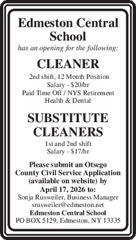 CLEANING PERSON female part time, 1 day a week. Salary open. Conesville, NY. 845-480-4697 or 914-426-2312.