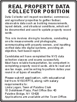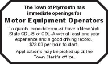 Town of German is accepting applications for a Motor Equipment Operator.Qualifications A current CDL-B or CDL-A License is required throughout employment and a driving record acceptable to the employing Municipality"s Insurance Carrier. Salary: Competitive> Please contact Town Clerk Ellen Maroney at 607 656-4493 for an application.