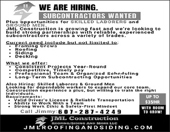 GENERAL CONTRACTOR looking to hire. Contruction Worker, General Laborer, Masonry Worker, Carpenter, Equipment Operator. CDL License a plus but not required. Experience helpful but also not required. Pay based on experience. Call 607-965-8413.